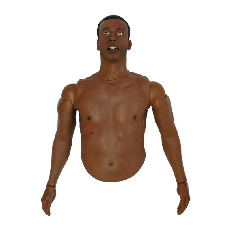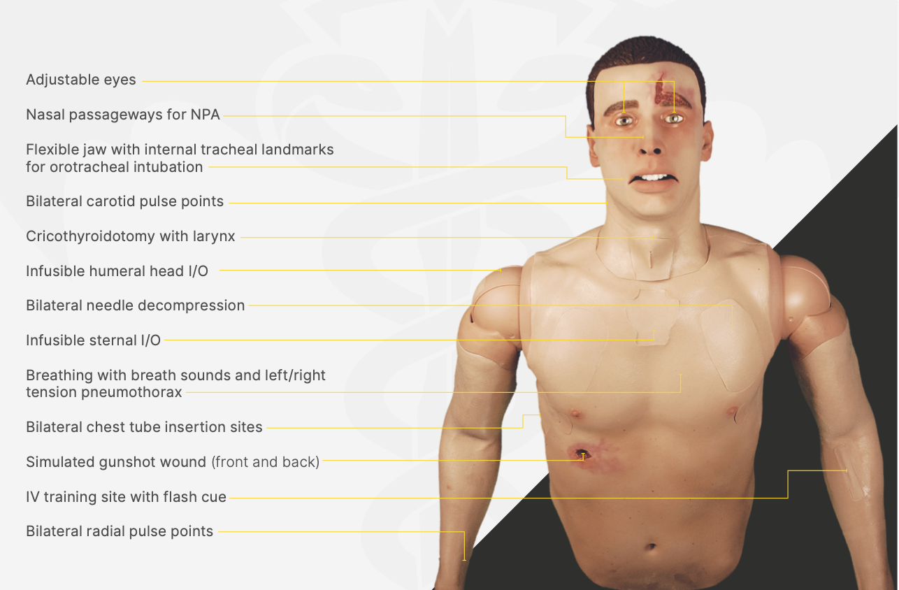 All TacMed Simulation high-fidelity simulators are operated by a long-range RC controller which includes real-time telemetry to monitor medical interventions. Easy to use, menu-driven software takes only minutes to learn and sensor data is immediately displayed on the main control screen for quick reference. The display shows key vitals and provides instructors with instant data on the effectiveness of student interventions such as tourniquet application, wound hemostasis, airway intervention, needle decompression, and chest tube placement.