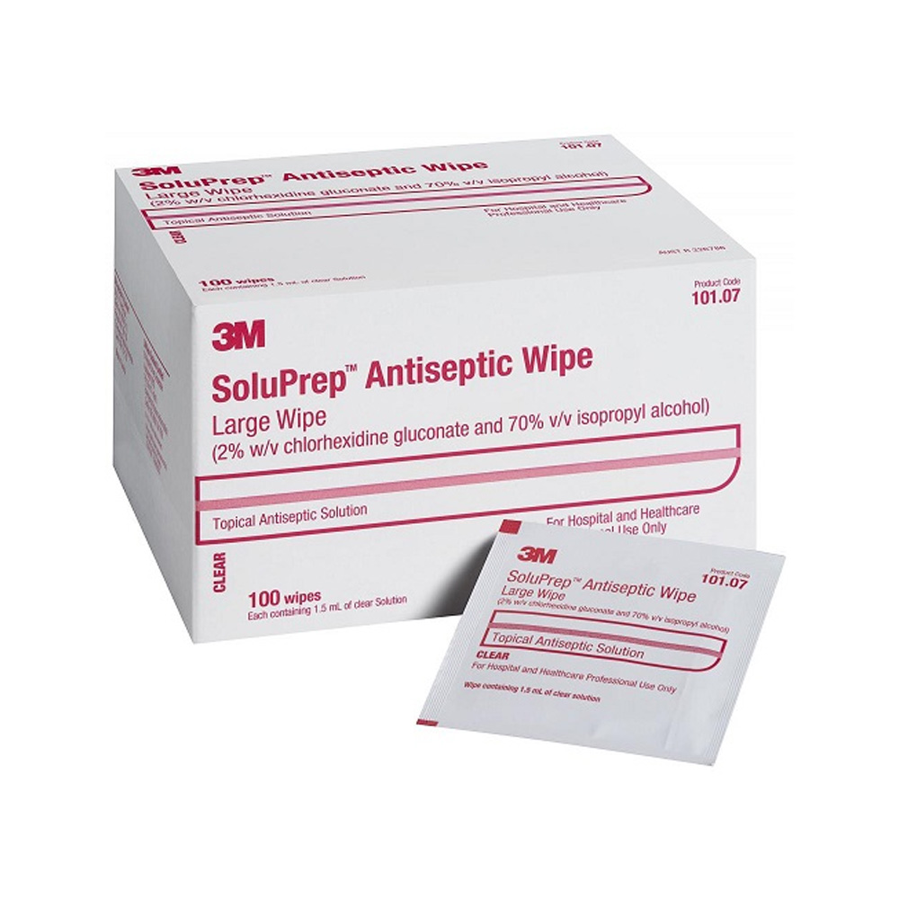 3M™ SoluPrep™ Wipes is a clear solution of 2% w/v chlorhexidine gluconate (CHG) and 70% v/v isopropyl alcohol (IPA). Indicated for skin antisepsis prior to invasive procedures, this product helps reduce bacteria on skin to diminish the risk of surgical site infection.